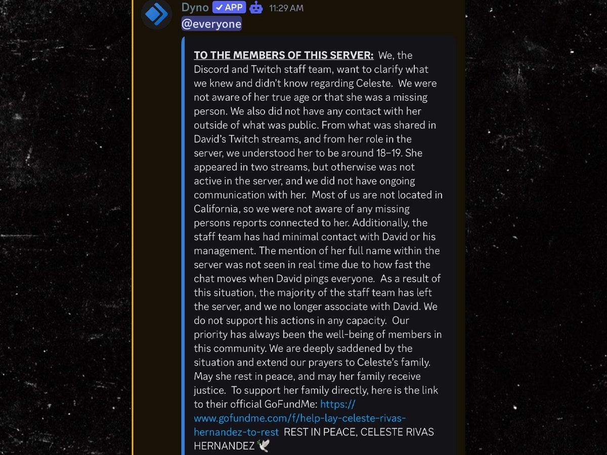 Также обращает на себя внимание пост человека, утверждавшего, что он модерирует Discord-сервер рэпера и его канал Twitch. Он заявил, что Селеста дважды появлялась на стримах музыканта, но его команда не знала реальный возраст девушки, полагая, что ей около 18–19 лет, а также не была в курсе того, что она считалась пропавшей.